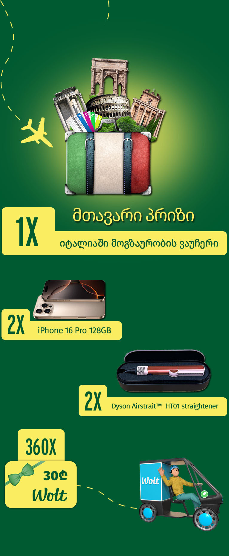 ყოველკვირეული პრიზის Wolt-ის ელექტრონული პრომო-კოდი იქნება ასახული გამარჯვებულის პირად სივრცეში, ციფრულ ფორმატში და ხელმისაწვდომი დაკოპირებისთვის.